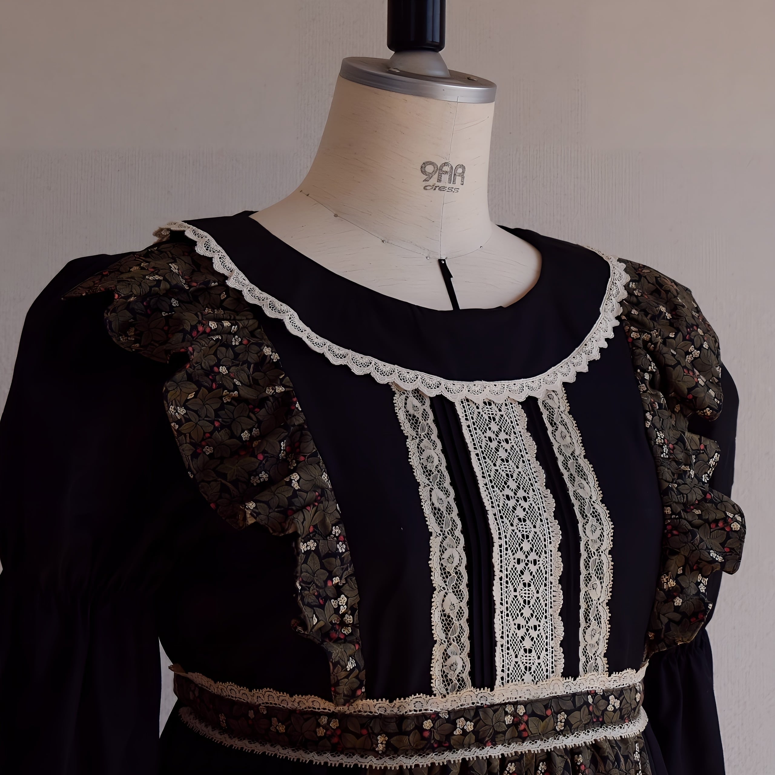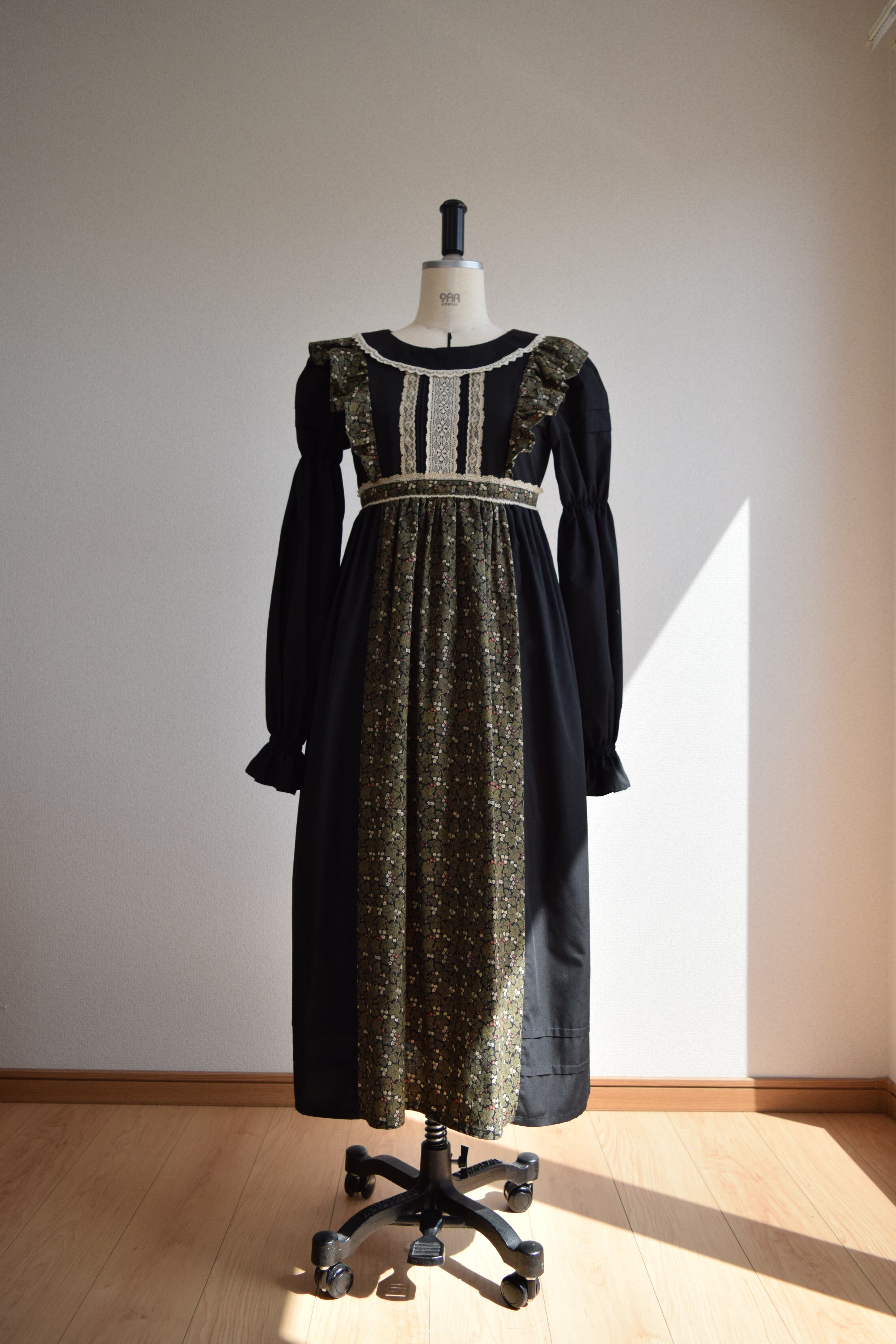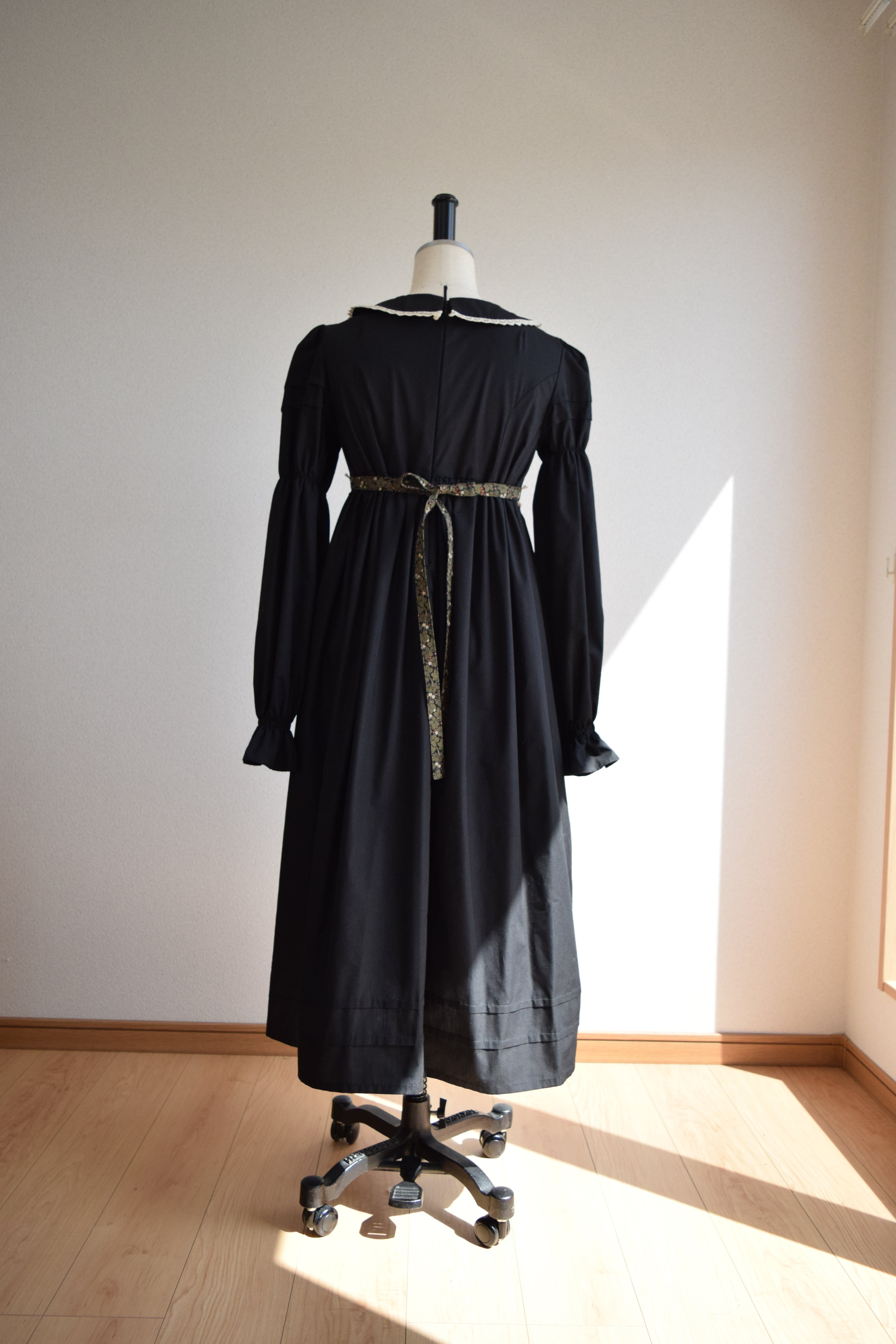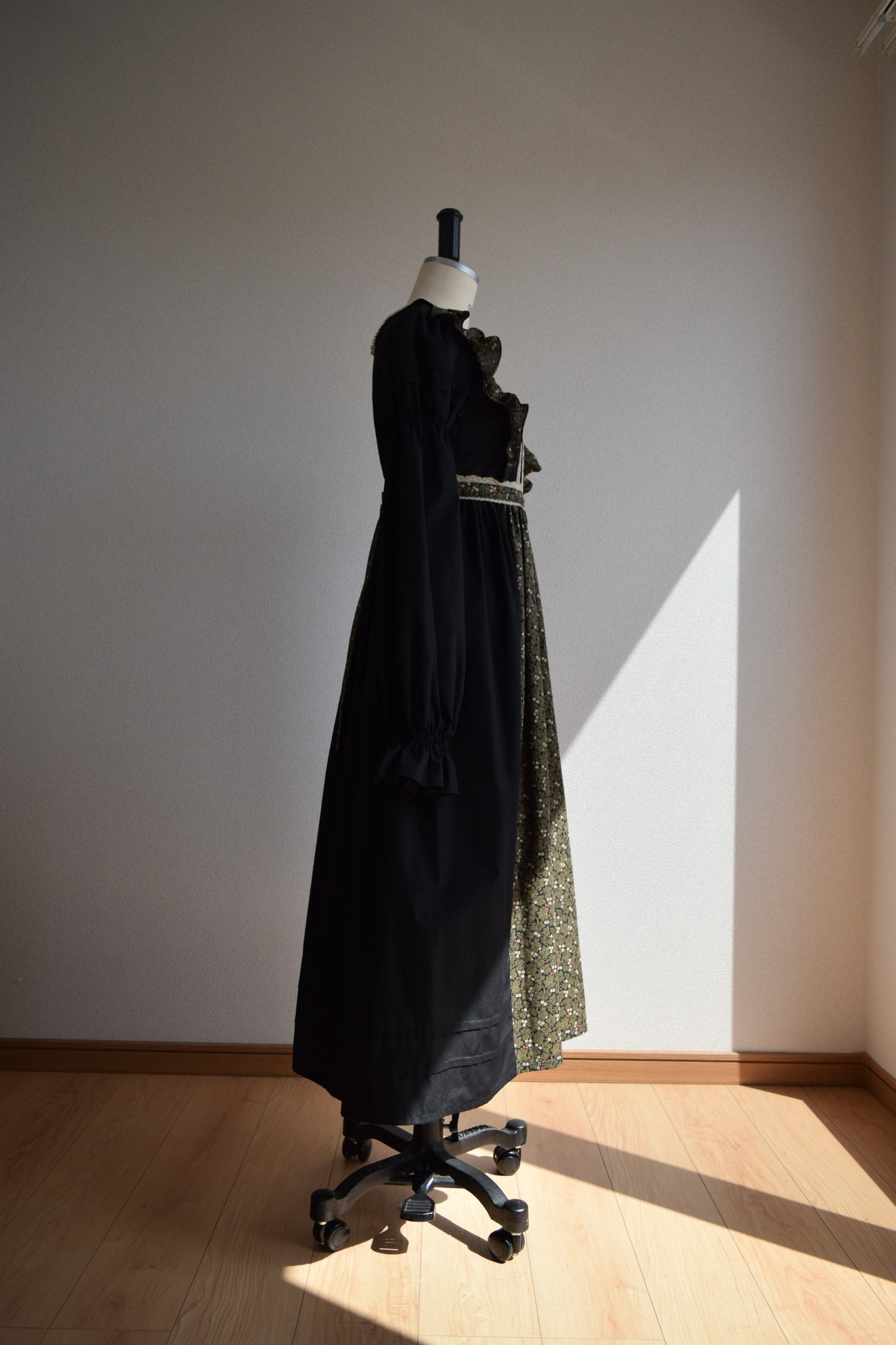 エドガー・アラン・ポーの短編『エレオノーラ』に思いを馳せてお仕立てしたドレスです。五色の草の谷間を駆ける少女を想像してエプロン風にデザインしました。